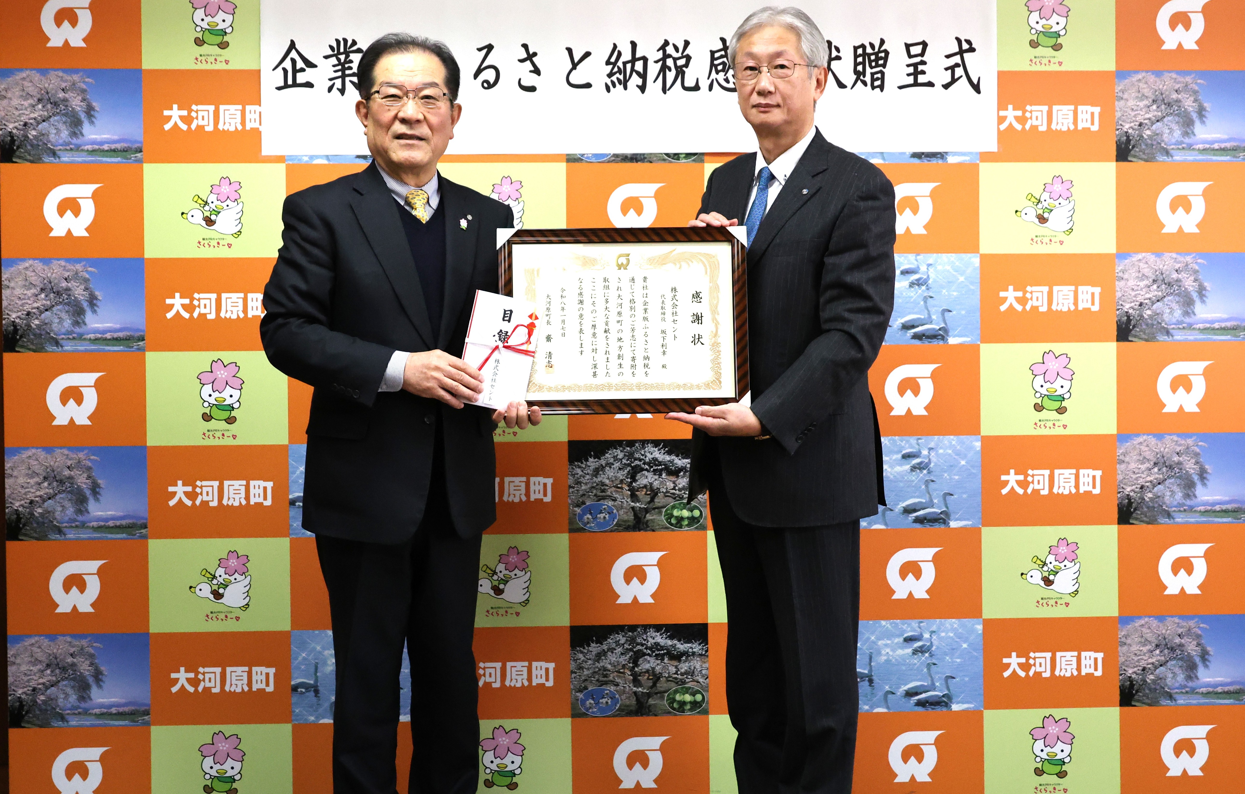 株式会社セント(本社:宮城県仙台市青葉区北根4丁目2番20号)様からのご支援に対して感謝の意を表するため、令和8年1月7日(水)に感謝状贈呈式を開催いたしました。(寄附額:ポータブル電源「MASTER 1000」@141,636円×8台 1,133,008円 寄附年月:令和7年12月) この度の寄附は、本町の「水防対策事業」に大切に活用させていただきます。 誠にありがとうございました。
