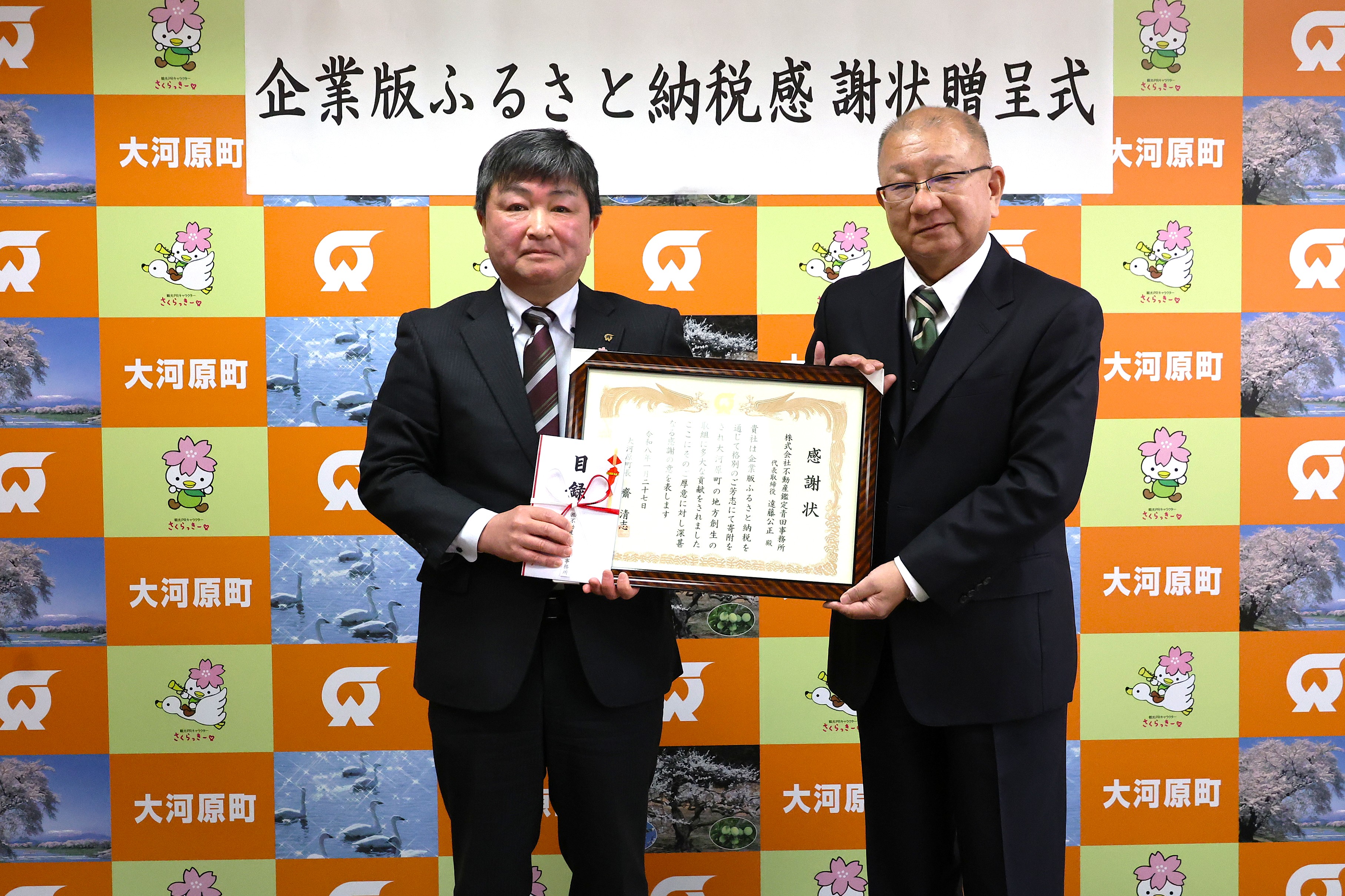 株式会社不動産鑑定青田事務所(本社:宮城県仙台市青葉区一番町2丁目1-1 仙台銀行ビル7階)様からのご支援に対して感謝の意を表するため、令和8年1月27日(火)に感謝状贈呈式を開催いたしました。(寄附額:令和6年度 50万円、令和7年度 50万円) この度の寄附は、本町の「白石川右岸河川敷等整備事業」に大切に活用させていただきます。 誠にありがとうございました。