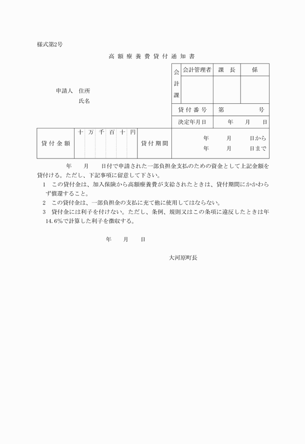 第3条 高額療養費の貸付を受けようとする者は、高額療養費貸付申請書(様式第1号)に当該一部負担金請求書又はこれに代るべき明細書を添えて、町長に申請しなければならない。