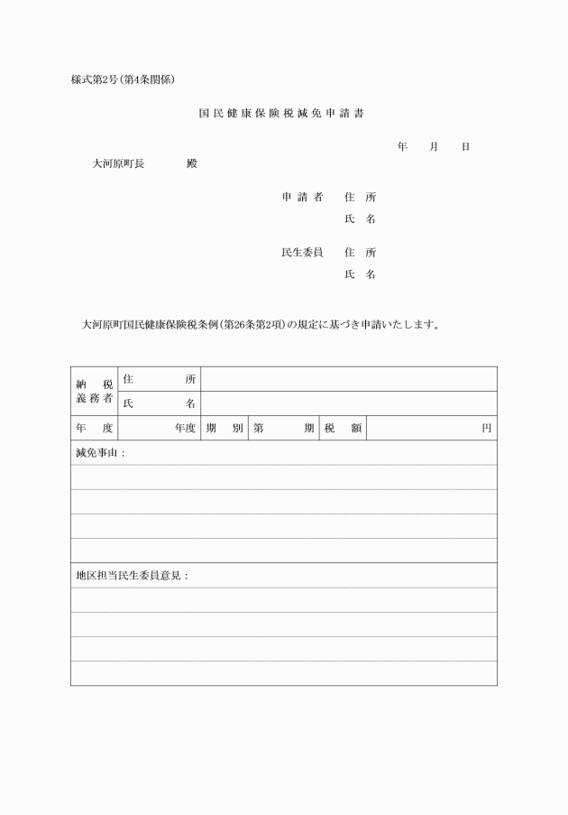 第4条 国民健康保険税の減免を受けようとする者は、国民健康保険税減免申請書(様式第2号)を町長に提出しなければならない。