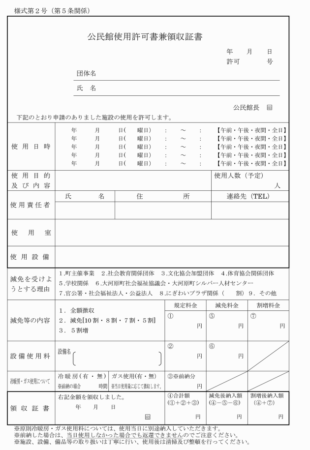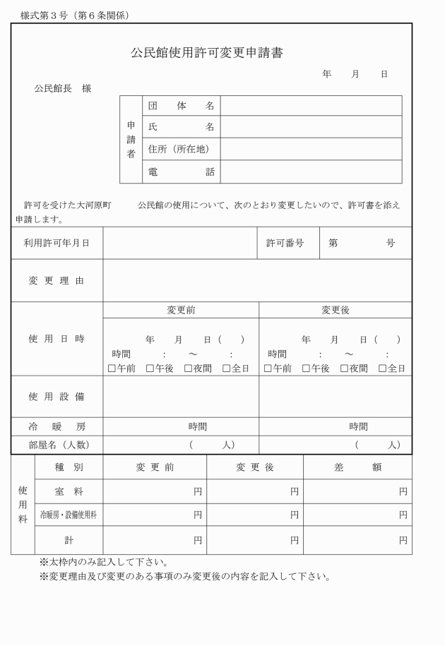 第6条 使用許可を受けたものが、使用許可の変更又は取消しの許可を受けようとする場合は、使用許可変更申請書(様式第3号)を、館長に提出しあらためてその許可を受けなければならない。