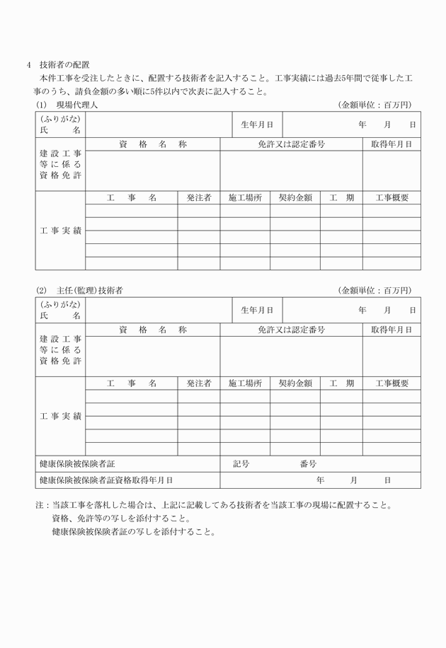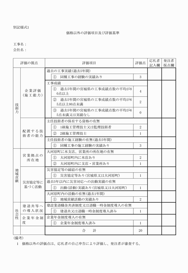 3 落札の方式を、価格のほかに、価格以外の技術的な要素等を評価の対象に加え、価格と技術面等の両面から最も優れたものをもって入札に参加した者を落札者とする場合は、制限付一般競争入札参加資格確認申請書(様式1の2)に、別に定める必要書類を添付するものとする。