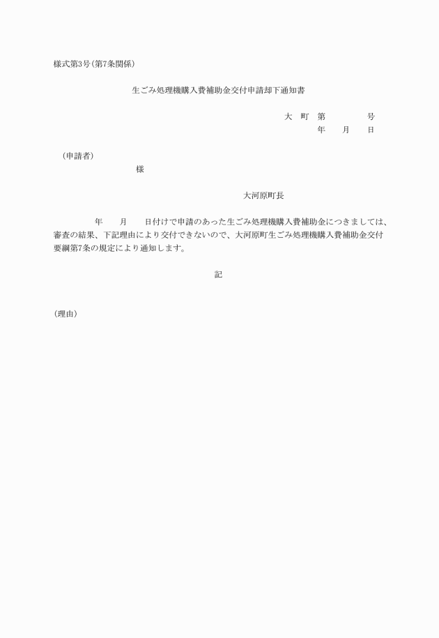 第6条 補助金の交付を受けようとする者(以下「申請者」という。)は、生ごみ処理機購入費補助金交付申請書(様式第1号)を町長に提出しなければならない。