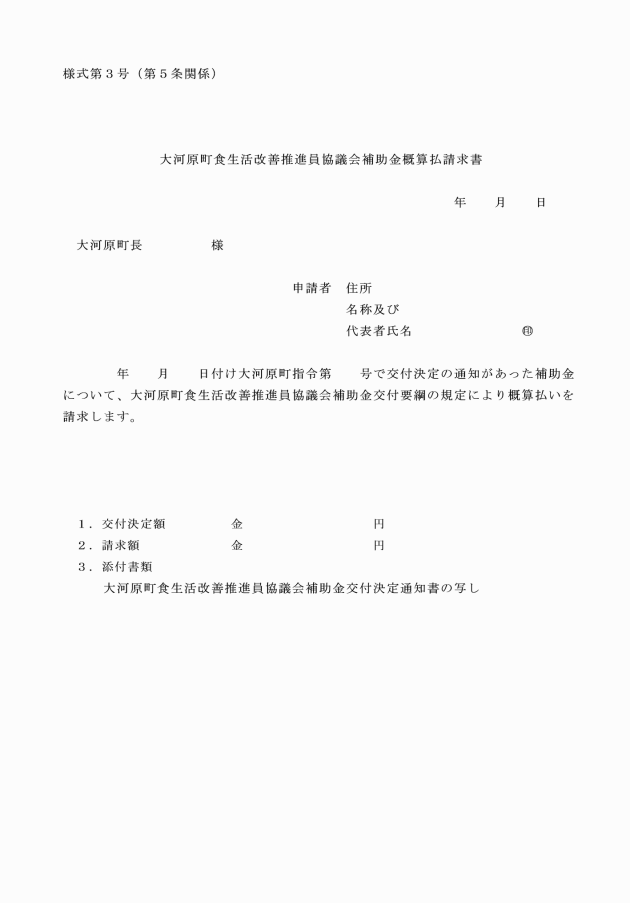 第4条 補助金の交付申請は、大河原町食生活改善推進員協議会補助金交付申請書(様式第1号)に、次に揚げる書類を添えて、町長に提出しなければならない。
