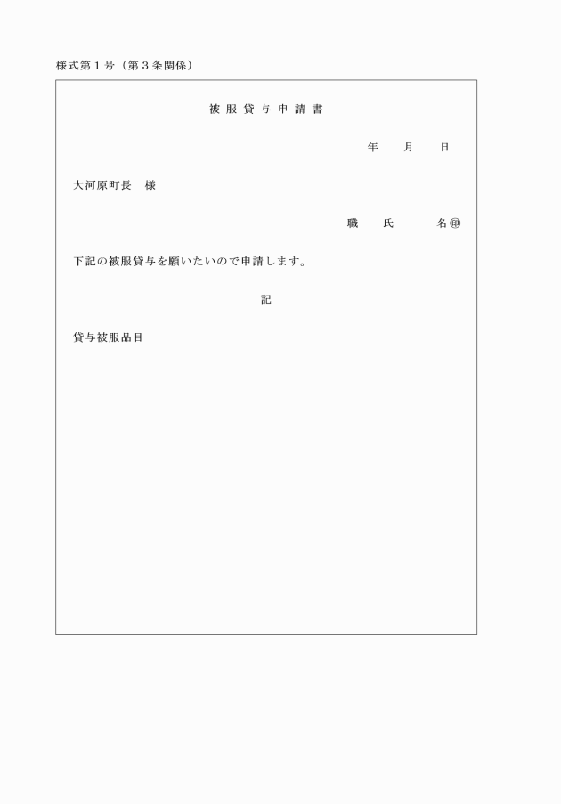 第3条 被服の貸与を受けようとする職員は、被服貸与申請書(様式第1号)を管理者(法第8条第2項の規定により水道事業及び公共下水道事業の管理者の権限を行う町長をいう。以下同じ。)に提出しなければならない。