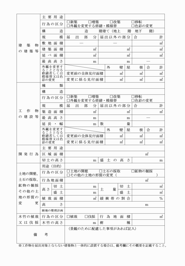 第4条 法第16条第1項の規定による届出は、景観計画の区域(以下「景観計画区域」という。)における行為の届出書(様式第1号)により行うものとする。