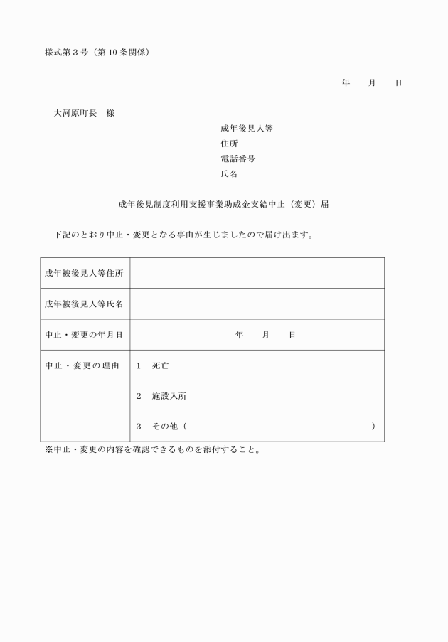 第10条 成年後見人等は、費用の助成を受けている者の死亡等により助成の理由が消滅したとき又は費用の助成を受けている者の施設の入退所等により助成の額に変更が生じたときは、成年後見制度利用支援事業助成金支給中止(変更)届(様式第3号)により速やかに町長に届け出なければならない。