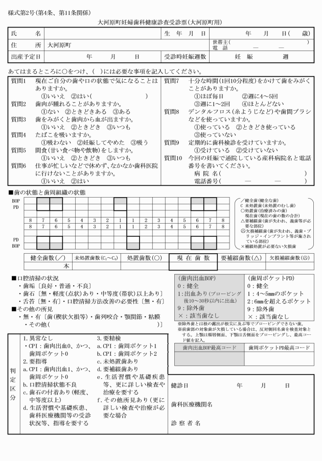 2 妊婦歯科健診を受診するときは、前条に規定する受診券、母子健康手帳、並びに受診票に必要事項を記入し、委託歯科医院に提出するものとする。
